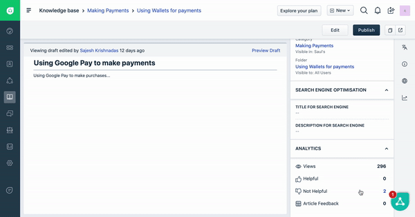 Not: Ayrıca Analytics bölümünün altında Önerilen adlı yeni bir metrik de bulabilirsiniz . Bu, temsilciler destek taleplerine yanıt verdiğinde bir makalenin müşterilere kaç kez önerildiğini gösterir.